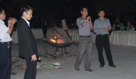 晚宴后,大家紛紛來(lái)到戶(hù)外,圍著篝火舉杯歡唱,在主持人幽默詼諧的帶領(lǐng)下,參與互動(dòng)的員工熱情高昂?;顒?dòng)一直持續(xù)到晚上10點(diǎn),大家仍然意猶未盡。