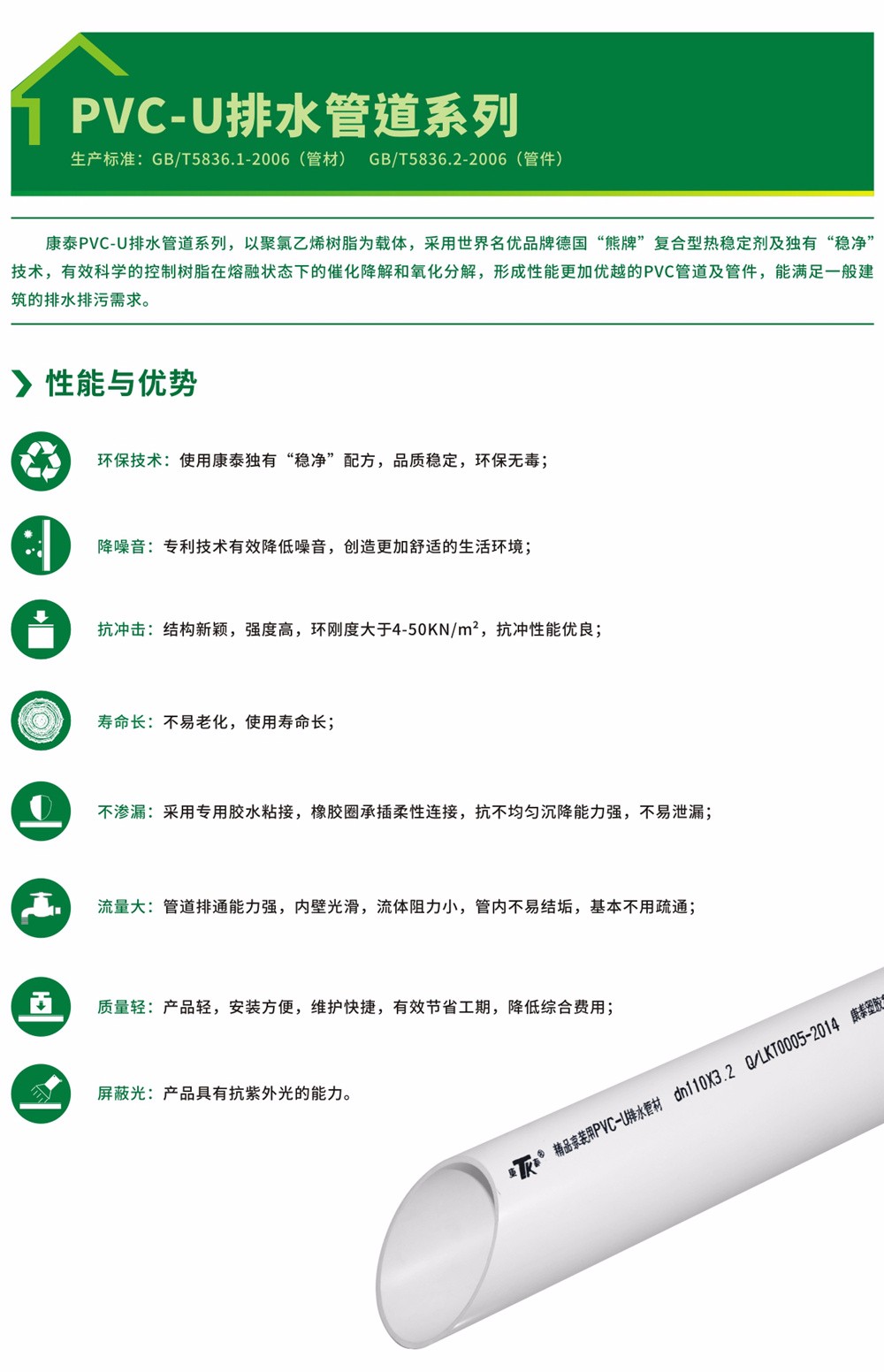 康泰PVC-U排水管道系列,以聚氯乙烯樹脂為載體,采用世界名優(yōu)品牌德國“熊牌”復(fù)合型熱穩(wěn)定劑及獨(dú)有“穩(wěn)凈”技術(shù),有效科學(xué)的控制樹脂在熔融狀態(tài)下的催化降解和氧化分解,形成性能更加優(yōu)越的PVC管道及管件,能滿足一般建筑的排水排污需求。