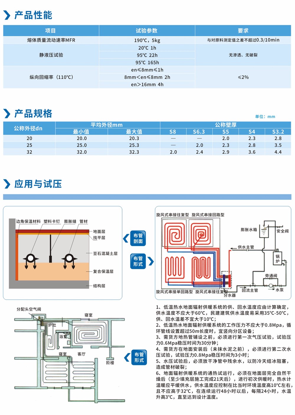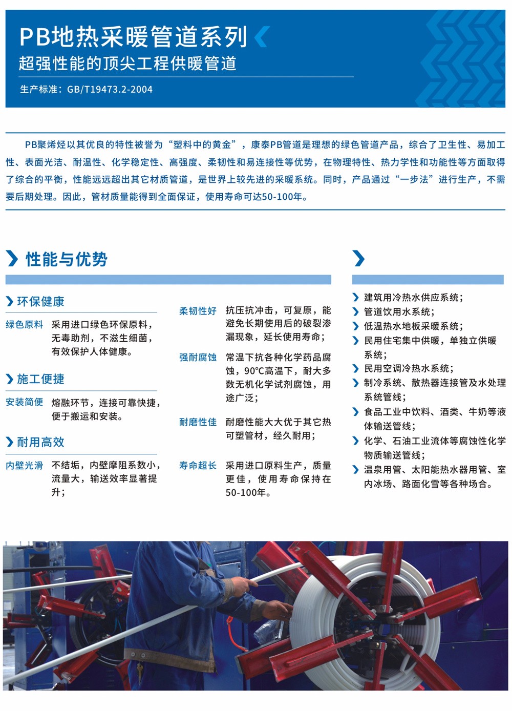 從結(jié)構(gòu)上來看,聚丁烯(PB) 是一種線性的半結(jié)晶性熱塑性材料,是一種高分子惰性聚合物,是世界上最先進的化學(xué)材料之一。加工和使用過程中無毒無污染,可以反復(fù)加熱成型。聚丁烯(PB)綜合了衛(wèi)生性、加工性、表面光潔度、耐溫性、化學(xué)穩(wěn)定性、強度、柔韌性和易連接性等優(yōu)勢,在物理特性、熱力學(xué)特性和功能性等方面取得了綜合的平衡,從而賦予了PB地熱采暖管管材諸多得天獨厚的特質(zhì),能夠用于流體輸送系統(tǒng),尤其在建筑內(nèi)的熱水輸送系統(tǒng)領(lǐng)域開辟了廣闊的用武之地,PB管道是世界上較先進的采暖系統(tǒng),他的優(yōu)良特性被越來越多的人關(guān)注,被譽為“塑料中的黃金”。 聚丁烯(PB)管材是目前較理想的地板采暖管材和冷熱水管材,其性能遠遠超出其它管材的,我公司生產(chǎn)的新型PB地板采暖管,采用PB專用料生產(chǎn),因此材質(zhì)是十分可靠的。PB管道的生產(chǎn),實現(xiàn)了真正的“一步法”,它不需要后期處理,因此,管材質(zhì)量能得到全面保證,使用壽命可達50年-100年。